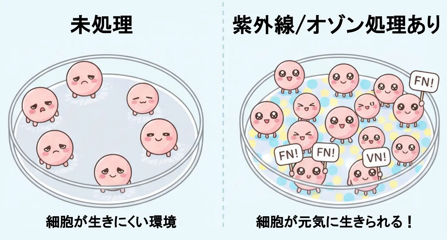 この課題を解決するため、材料表面に紫外線とオゾンの両方(UVO)[用語4]を照射して親水性(水になじみやすい性質)を高める処理が広く行われています。しかし、このUVO処理時間が長すぎるとかえって細胞の接着性が低下することが知られており、なぜ最適な照射時間が存在するのか、その根本的なメカニズムは完全には解明されていませんでした。合理的な材料設計を行うためにも、この謎を解明することが求められていました。