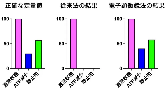 本研究では出芽酵母を用いて、①通常の増殖中の細胞、②薬剤でATP産生を阻害した細胞、③栄養源枯渇で静止期に入った細胞の三つの状態で、1)質量分析法で測定した正確なPI4,5P2量、2)従来用いられてきた顕微鏡法によるPI4,5P2の推定量、3)本研究グループが開発した電子顕微鏡法によるPI4,5P2の推定量の3つのデータを得ました。②、③の条件では、①と比べてPI4,5P2が減少することが予想されたので、まず1)の方法を用いて、①を基準とした場合の②、③のPI4,5P2の相対量を調べました。その結果、①のPI4,5P2量を100とした場合、②では30.0, ③では56.6であることが分かりました。ついで2)、3)の方法を用いて、同様に①を基準とした場合の②、③のPI4,5P2の相対量を調べたところ、3)の方法では②は40.2、③は58.0という結果でしたが、2)の方法では②③とも検出限界以下となって検出できませんでした(図2)。またさらに2)の方法では、PI4,5P2が集中するはずの部位にPI4,5P2を検出できないという問題がありましたが、3)の方法では同部位へのPI4,5P2の集中が明瞭に示されました。これらの結果より、今回用いた電子顕微鏡法が高精度かつ定量的にPI4,5P2の分布を決定できることが明らかになりました。