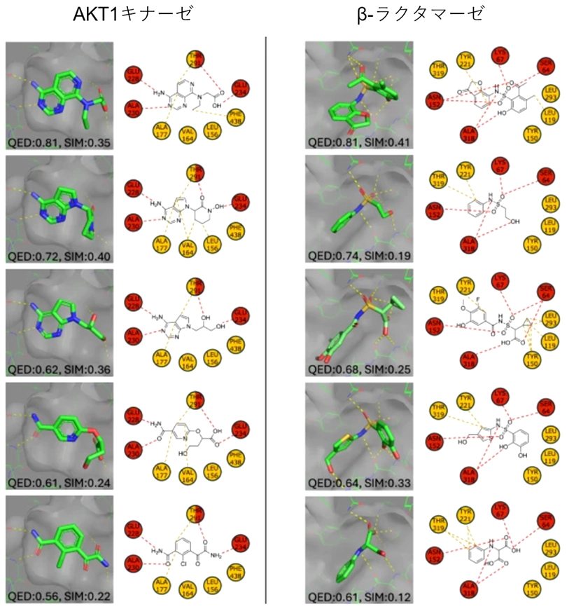 また、AKTキナーゼやβラクタマーゼなどの創薬ターゲットタンパク質に対して新規分子を生成した結果、重要な相互作用を維持したまま異なる化学構造を持つ分子系列を設計できることが確認されました(図2)。特に図2に示すように、生成された分子は既知分子とほぼ同様の相互作用パターン(点線の結ばれ方)を維持しており、結合様式を保ったまま構造の異なる分子を複数設計できていることが分かります。