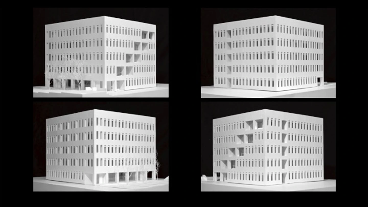 さらに、東西南北のどの面にも縦長の窓を同じ間隔で配置することで、すべての面が正面になるような印象をもたせました。「しかし、よく見ると1階から最上階に向けて、大きな窓を垂直や水平、斜めに連ねて配置しているのがわかると思います。このような窓の配置は、建物と太陽の向きとの関係や、建物内の部屋の用途に対応したものです。“立方体”と“窓”という建築の根源的な要素がもつ特性を理解し、周囲の環境と応答させることで、『パッシブデザイン』を実現しているのです」