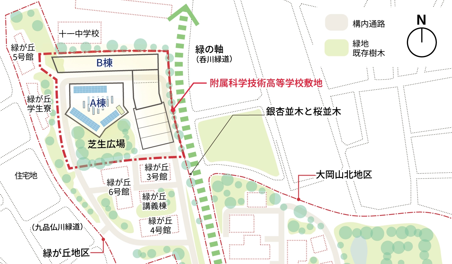 「この附属高校は全国で唯一の国立大学附属の科学技術系高校です。一般科目に加え、応用化学、情報システム、機械システム、電気電子、建築デザインの5つの分野があり、あたかも大学のミニチュア版のような面白さがあります。新校舎の設計に当たっては、大岡山キャンパスの中でも緑が丘地区という樹木と起伏に富んだ自然地形に応答するパッシブデザインを考えました」。