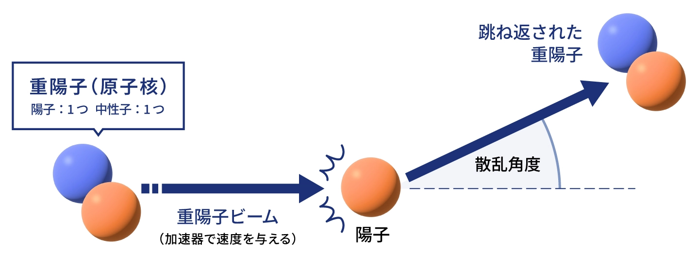 関口が行った実験とはどのような内容だったのでしょうか。それは、加速器と呼ばれる大型装置を使って、光の速度(=秒速29万9792458km)の30~40%という超高速まで加速した重陽子を1つの核子に照射し、それによって跳ね返された重陽子の角度(「散乱角度」)を測るというもので、「散乱実験」と呼ばれています(図2)。