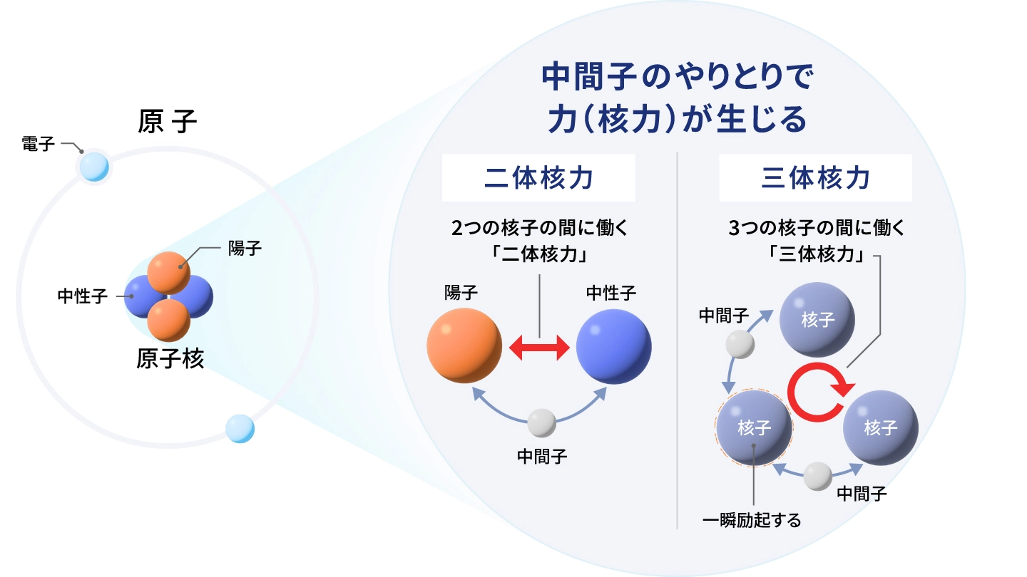 「2つの核子の間では核力は起こりやすいのですが、安定している2つの核子の間にさらに新たな核子が入り込むことは難しいため、3つの核子の間で核力を起こすには、高いエネルギーが必要です。実際、二体核力、三体核力……と核子の数が増えるにしたがって、その存在確率は10分の1ずつ減っていくことが分かっています」(関口)