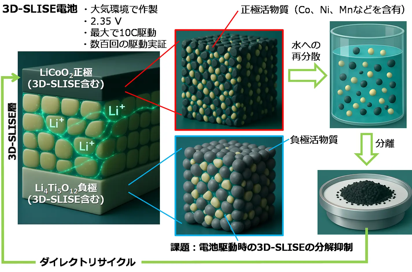 本研究で作製した「非晶質Li2B4O7-LiFSI-H2O」から構成される水系複合準固体電解質(3D-SLISE、図1)は、>1 mS/cmのイオン伝導性を示します。非晶質Li2B4O7と水のスライム化反応[参考文献1]により、Liイオンの高い伝導性と素材界面の優れた密着性を両立する「準固体界面」が形成されます。この3D-SLISEを用いることで、全ての電池作製プロセスを大気中で行うことができるようになりました。作製した電池(3D-SLISE電池、図2)は最大で10Cの条件にて高速駆動すること、3C条件下で400回以上駆動することを確認しました。さらに、電池評価後の正極を水に再分散することでコバルトなどの希少元素を含む正極活物質を直接回収できることを確認しました。不良品や使用済み電池から高価な正極活物質を直接分離回収して再利用する「ダイレクトリサイクル」プロセスの可能性を示す結果です。