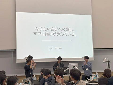 制作した「AYUMI:なりたい自分への道は、すでに誰かが歩んでいる」は、「なりたい人物の過去を辿り、次の一歩を見つける」というコンセプトに基づき、先輩たちのキャリアパスと自身のキャリアプランを比較できる、キャリア相談型アプリです。先輩たちのデータをもとに生成されたAIモデルとテキストベースでチャットできる点が特徴です。