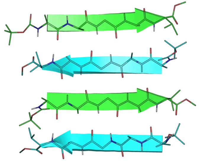 生体内で生命機能を担うタンパク質の立体構造中には、βシート構造が至るところに見られます。βシート構造は、真っ直ぐに伸びたペプチド鎖が複数会合し、互いに水素結合によって安定なシート状となった分子構造であり、タンパク質の構造安定性を大きく高める性質や、タンパク質同士の会合に関わる役割が知られています。そのような生体の優れた分子構造を人工的に利用するために、βシート構造の人工合成や材料への応用が盛んに研究されていますが、βシート構造を形成するペプチド配列には、鎖間に相互作用が強く働くために、会合の制御は困難であり、精密にペプチド鎖を配置させることが大きな課題となっていました。