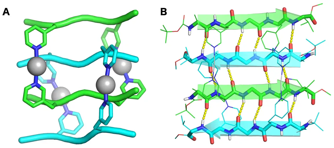 本研究では、ペプチド同士の無秩序な凝集を避けるため、ペプチドに金属イオンと結合する設計を施しました。ペプチドが金属イオンと結合することで、うまく自己組織化が引き起こされ、精密な4本鎖βシート構造を自発的に形成させることに成功しました。