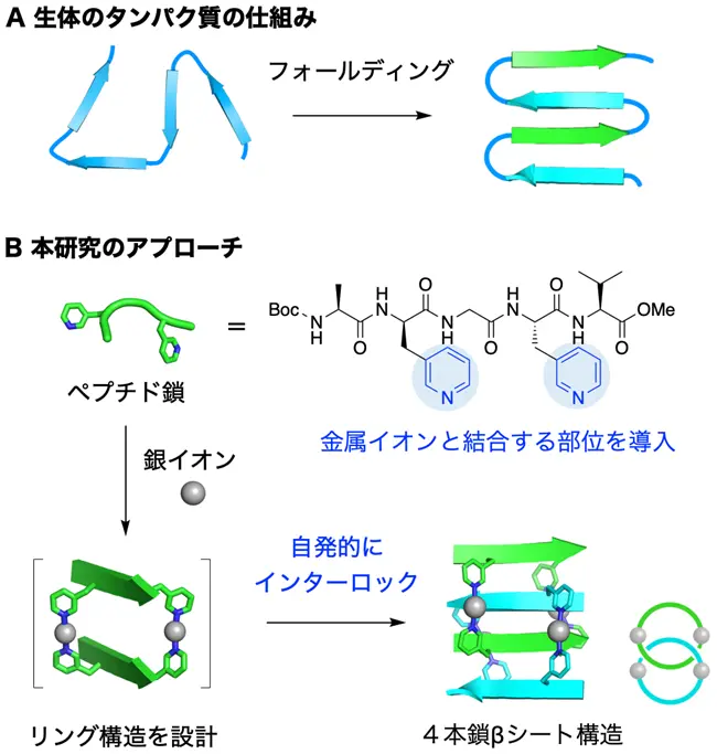 今回新たに、βシートの側面に金属イオンとの結合サイトを加え、金属イオンによる自己組織化[用語3]を利用することで、4本鎖のβシート構造の精密合成が可能になりました。その設計として、2本のペプチドを金属イオンで連結してできるリング構造を互いにインターロック[用語4]させる独自のアプローチを考案しました。この設計により、βシート構造をとるペプチド鎖の本数のみならず、各鎖の配向およびずれも精密に制御されることを解明しました。本成果で得られた合成法をもとに、βシート構造を基盤とする機能性ペプチド材料の創成に向けた応用が期待できます。