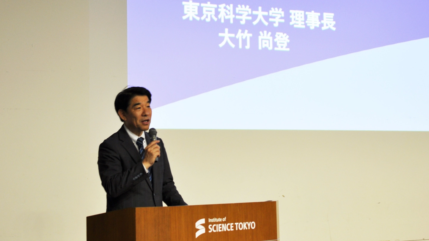 シンポジウムでは、プログラム総括の岩波光保環境・社会理工学院長の開会のあいさつとプログラムの概要説明に続き、大竹尚登理事長が「東京科学大学の設立とこれから」と題した講演を行いました。講演の中で大竹理事長は、善き生活、善き社会、善き地球をつくりあげる大学というScience Tokyoのビジョンと、その実現のための研究教育組織「Visionary Initiative(VI:ビジョナリーイニシアティブ)[用語1]」について紹介するとともに、Science Tokyoが目指すべき方向は本プログラムと親和性があると述べました。