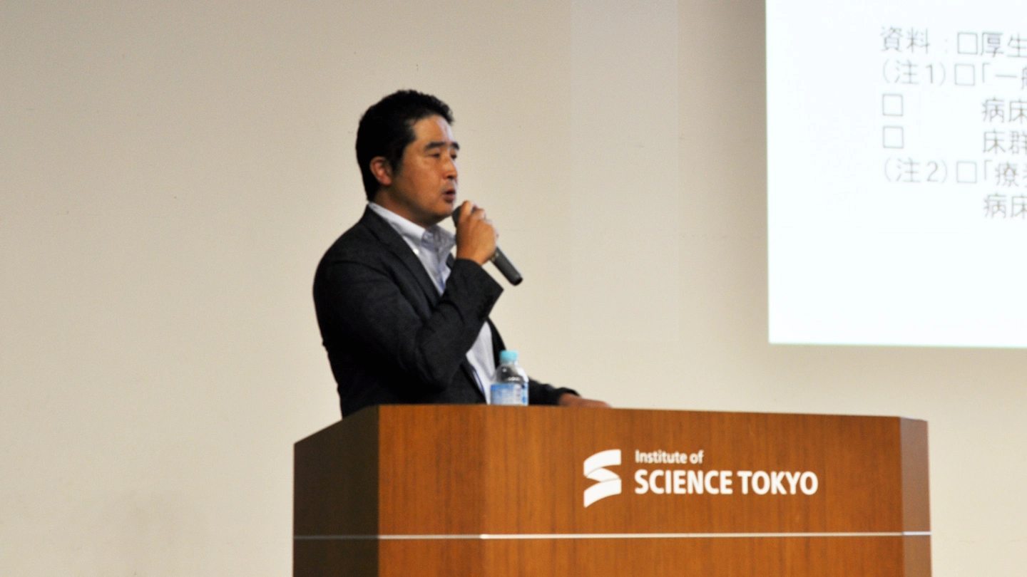 大学院医歯学総合研究科の岡田就将教授は、「今後のわが国の医療の姿~行政目線で見えてくること~」と題して、国民皆保険制度のもとでの急性期医療体制の整備、地域包括ケアシステムについて講演しました。さらに、疾病構造の高齢者型への変化、少子化に伴う働き手不足、家族看護力の低下など顕在化する社会課題に対応して、医療情報インフラの整備や遠隔診療の活用などをまちづくりの中で実現していくことが国民のウェルビーイングの確保につながるだけでなく、アジア諸国に対して好例を示すことになると述べました。