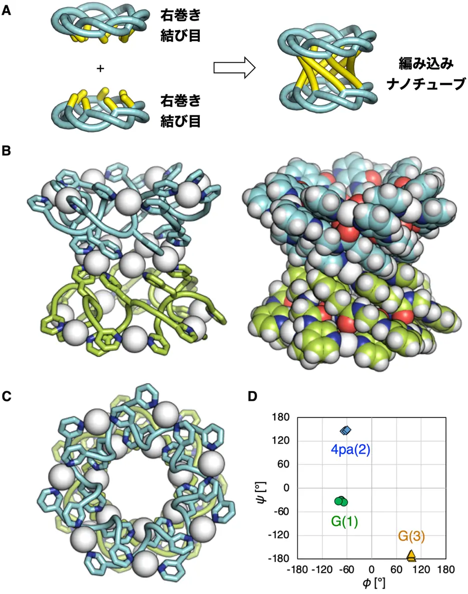 次に、Aの位置を変えた、G-A-G配列のペプチドからは右巻きの結び目が生成すると予測しました(図2D)。アラニンがつくる二面角の値はP2領域には位置しますが、M2領域には位置しないためです(図3BC)。実際に、この配列のペプチドを合成し、銀イオンと溶液中で混ぜ合わせることで、結び目構造へ組み上がったことがNMR測定により確認されました。さらに、このG-A-G配列のアラニン側鎖の先に金属イオンとの結合部位(ピリジル基)を新たに導入する設計を考案しました(図2E)。これにより、二つの結び目構造同士が金属イオンを介して合体すると予想したためです。G-4pa-G配列(4pa:4-ピリジル-L-アラニン)のペプチドを合成し、銀イオンと混合すると、NMR測定から新たな生成物が観測されました。この溶液から単結晶を作成し、X線結晶構造解析によって、右巻きの七つ葉結び目構造が合体した編み込みペプチドナノチューブ構造を形成していることを実証しました(図5)。これにより、分子鎖の編み込みによって円筒構造が構築可能であることが明らかとなりました。