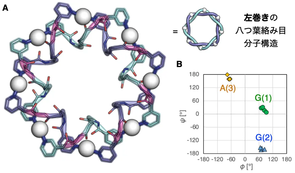 実際に、G-G-A配列のペプチドと銀イオンを溶液中で混合し、その溶液のNMR測定[用語11]を行うと、七つ葉結び目と八つ葉絡み目由来のシグナルがそれぞれ1セットずつのみ確認され、左巻きの構造のみが生成していることが示唆されました。この溶液から得られた単結晶をX線結晶構造解析[用語12]により調べたところ、確かに左巻き構造が形成されていることを、原子レベルの分解能で観察することができました(図4)。