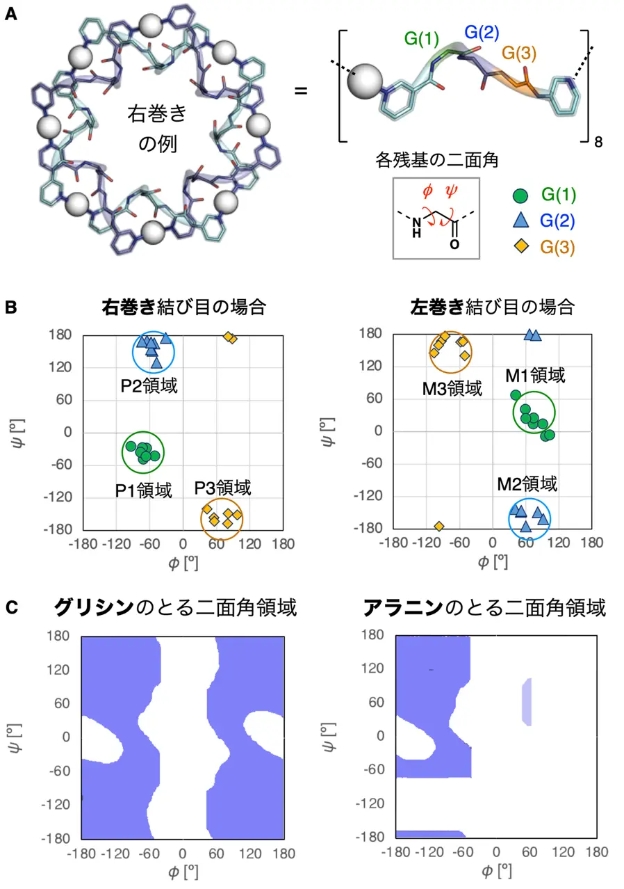 具体的には、G-G-A配列を設計し、これと銀イオンを混合することで、左巻きの結び目構造となることを予測しました(図2C)。その根拠は、結び目構造を形成する際に、ペプチドの各残基のとる二面角[用語10]が、グリシンと比べてアラニンでは制限がかかるためです(図3C)。右巻きの結び目構造を形成するためには、ペプチド配列X1-X2-X3の各アミノ酸残基の二面角はそれぞれ、図3Bに示すグラフのP1、P2、P3の領域の値である必要があります(図3AB)。左巻きの結び目構造の場合には、その原点対称の位置であるM1、M2、M3の領域の値である必要があります。グリシンの二面角の値はいずれの領域にも位置しますが、アラニンの場合の二面角の値はM3領域には位置しますが、P3領域には位置しません。したがって、G-G-A配列では左巻きの結び目構造になると予測しました。