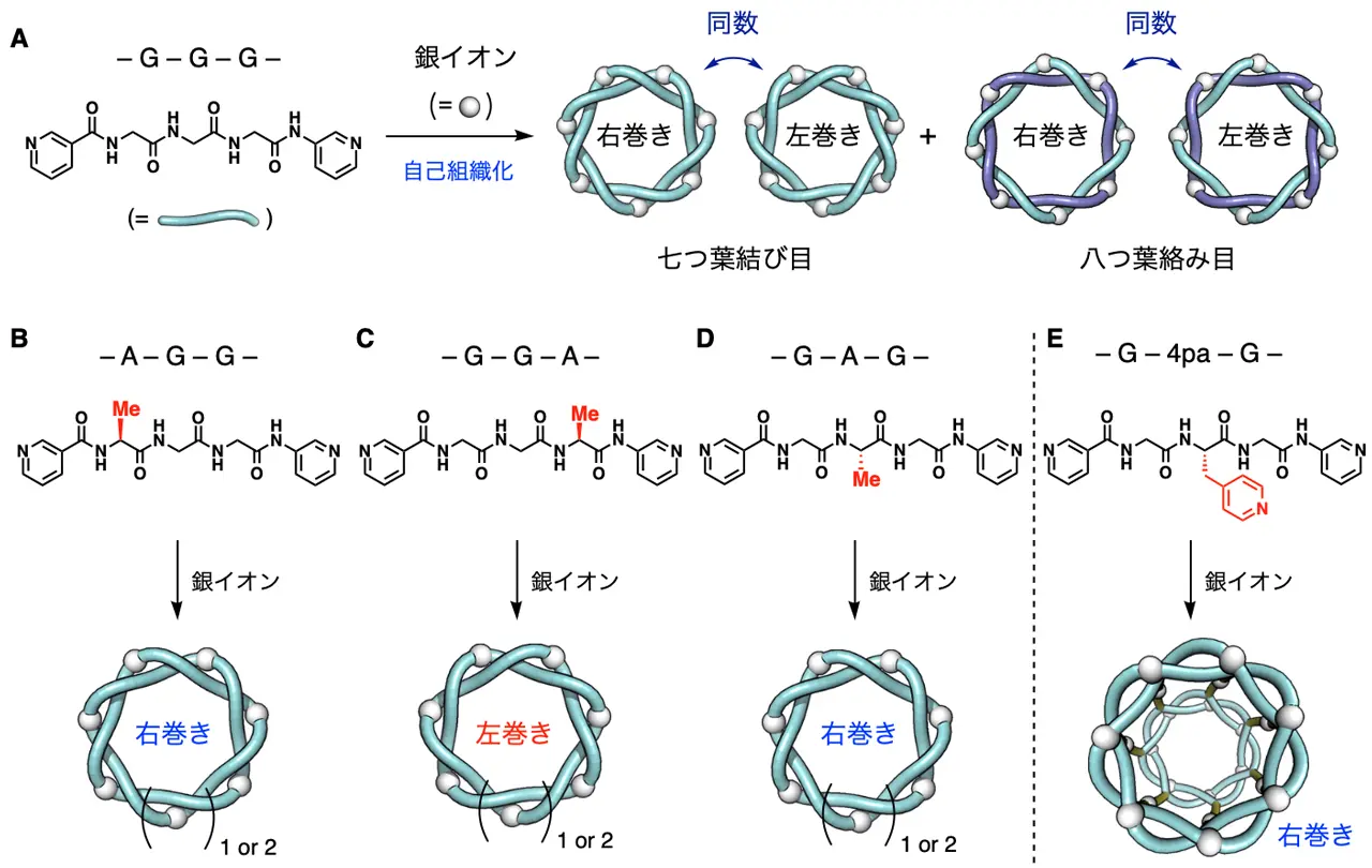 (A:G-G-G配列では右巻き・左巻きが同数生成、B〜D:配列にAを入れて右巻き・左巻きを制御、E:側鎖に金属結合部位を入れて編み込みナノチューブ構造を構築)