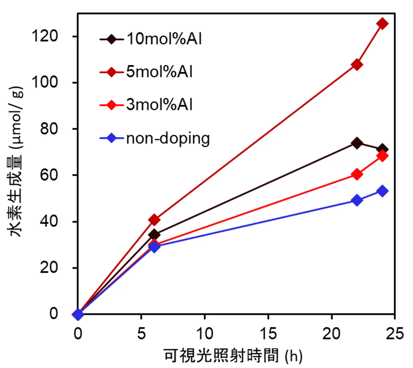 最後に、これらの薄膜試料に可視光を照射した場合の水素生成量を測定しました。この結果、Al塩添加量の増加とともに光触媒活性も向上し、添加量が5 mol%で最大の活性を示しました(図6)。活性が高かった理由を考察するため、Al塩の添加量5 mol%の試料と、ドープしていない試料に対して光電気化学インピーダンス測定[用語15]を行いました。この結果、ドープしない試料では、Alイオンをドープした試料と比較して全体的な電荷移動プロセスの効率が低く、バルクからの表面への電荷供給が制限されていることが示唆されました。すなわち、Alイオンのドープにより、電荷移動プロセスが改善され、光触媒活性の向上につながったと考えられます。一方、Al塩の添加量が10 mol%の場合は、5 mol%の試料と比べて光触媒活性が低下しました。図5のSEM像に示されたように、Al塩の添加量が増加すると結晶のサイズが大きくなります。このことからドープ量の多い試料では、光励起キャリアが拡散できる距離よりも結晶のサイズが大きくなるため、キャリアが表面に到達しにくくなり、結果として活性が低下したものと考えられます。