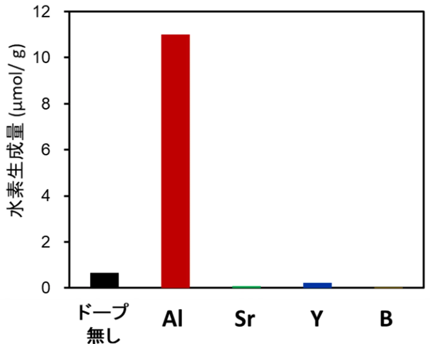 合成に成功したAl、Sr、Y、Bの各イオンをドープしたo-Sn3O4について、光触媒活性を評価しました。図4に可視光照射下における水素生成量を示した通り、Alイオンをドープしたo-Sn3O4の光触媒活性が飛躍的に向上しました。活性向上の一因である、ドープによる電子構造の変化について調べるため、光吸収スペクトルによるバンドギャップ[用語12]、光電子収量分光[用語13]による価電子帯[用語14]の位置を評価したところ、Alイオンのドープの有無で大きな違いは認められませんでした。これらの結果から、光触媒活性の向上は、電子構造の変化ではなく、Alイオンのドープに伴う結晶性や微細組織の変化などが要因と考えられます。