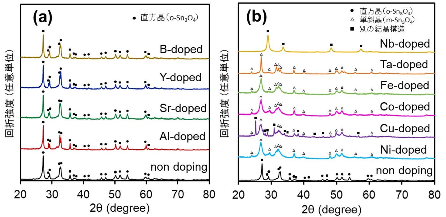 - 可視光応答型光触媒である直方晶の四酸化三スズ(o-Sn3O4)を異種イオンのドープにより高活性化