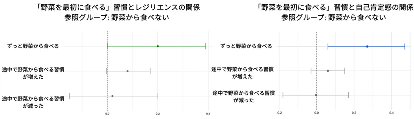 その結果、1年生から6年生までずっと野菜から食べていた子どもは、その習慣が全くなかった子どもと比べて、6年生時点におけるレジリエンスおよび自己肯定感の標準化スコアが統計解析(回帰分析)において有意に高いことが分かりました。具体的には、野菜から食べていた群は、習慣がなかった群に比べ、レジリエンスが0.20ポイント、自己肯定感が0.27ポイント高い結果となりました(図1)。