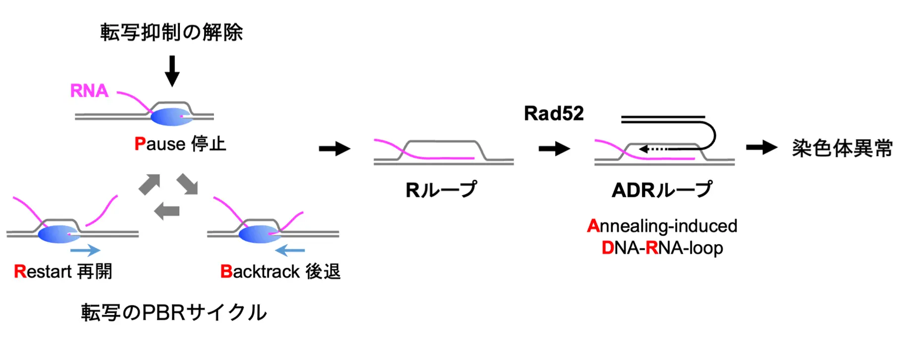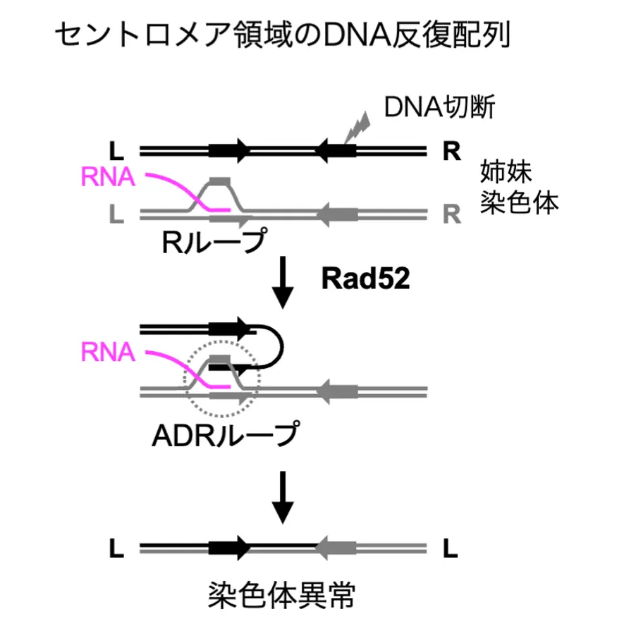 - 染色体のセントロメア領域で転写が活発に起きると、RNAが鋳型DNAと安定結合してRループが蓄積し、組換え酵素Rad52蛋白がRループをADRループに変換することで染色体異常を起こすことを発見。