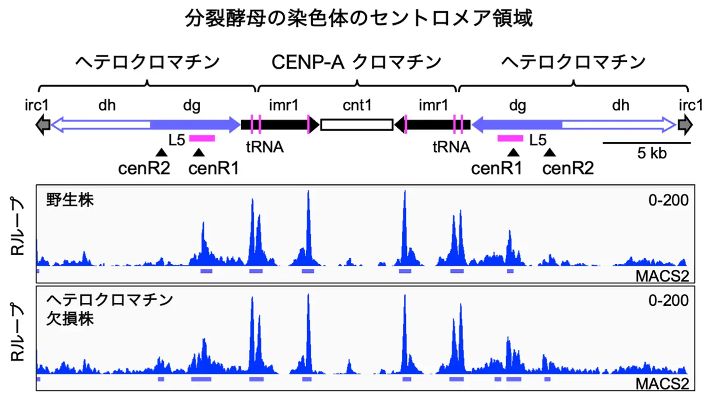 研究グループは、DNA:RNAハイブリッドに特異的に結合するS9.6抗体を利用してDNA:RNAクロマチン免疫沈降(DRIP)を行いました。その結果、分裂酵母では、セントロメア領域で転写のPBRサイクルが起きるとRループが蓄積し、このRループの蓄積が染色体異常を引き起こすことを明らかにしました(図1)。