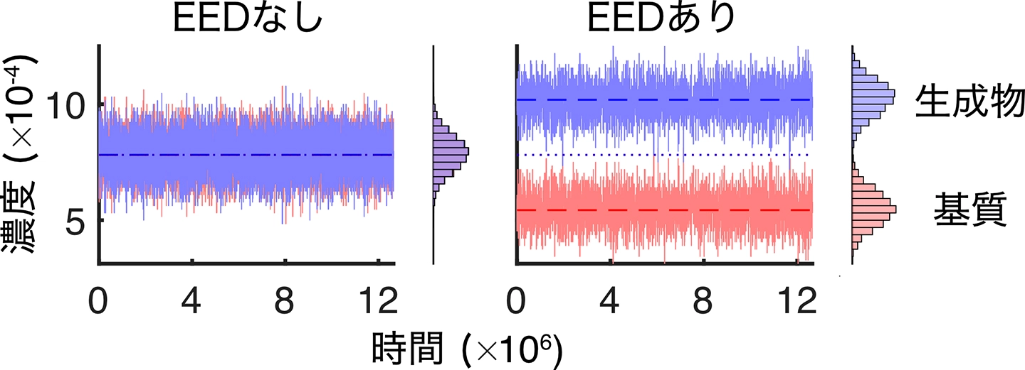 EEDがない場合では、生成物と基質の濃度は化学平衡と一致する(ここでは、化学平衡で両者の濃度が釣り合うようにしてある)が、EEDがある場合では正反応と逆反応のバランスが破れ、生成物の濃度が増加する。