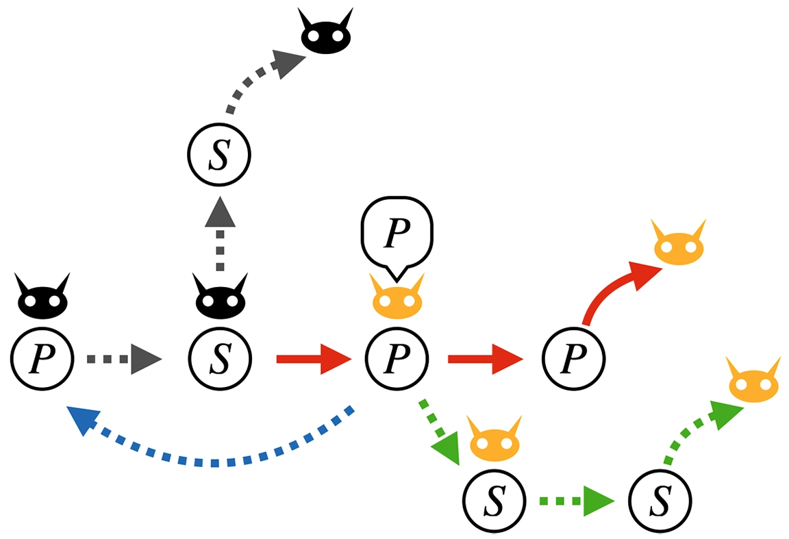 Sは基質、Pは生成物を表す。悪魔の顔が黒い場合、酵素はEED状態ではなく、黄色い場合、酵素はEED状態である。酵素が基質を触媒したという情報がEED状態として記録されると、その情報により逆反応が起きる確率が減少し、化学平衡からの逸脱が生じる(赤矢印)。元々の拡散速度が高すぎたり(灰矢印)、EED状態の持続時間が短すぎたり(青矢印)、反応速度が速すぎて酵素が離れる前に逆反応が起きたりすると(緑矢印)、情報が失われ、化学平衡からの逸脱は生じない。