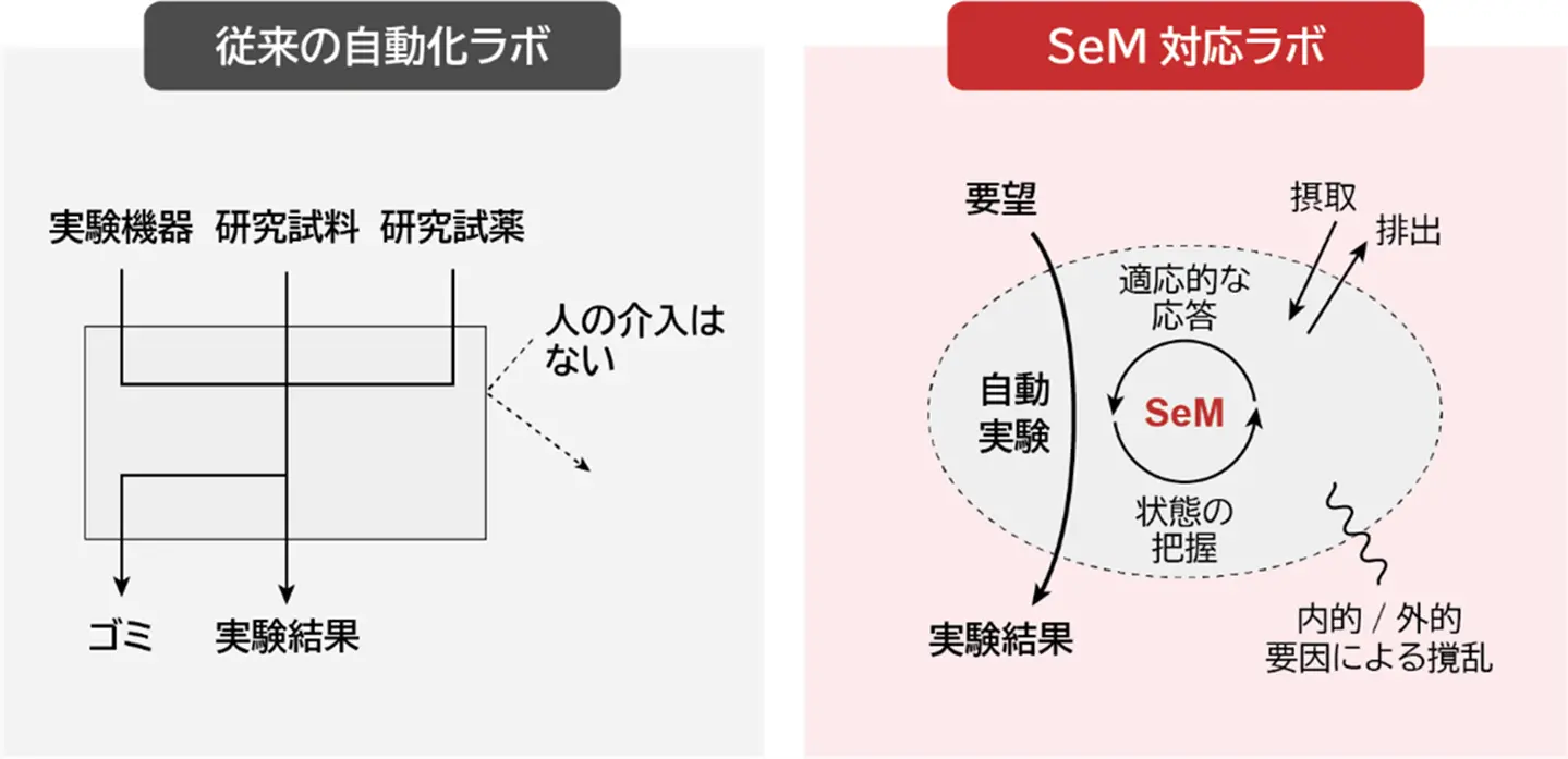 従来の自動化ラボ(左)では「自動化」の範囲とされていなかった実験システムへの試薬・消耗品出入りや、想定外の撹乱(かくらん)に対して、SeM対応ラボ(右)は自身の状態を把握し対応する能力を持つ。