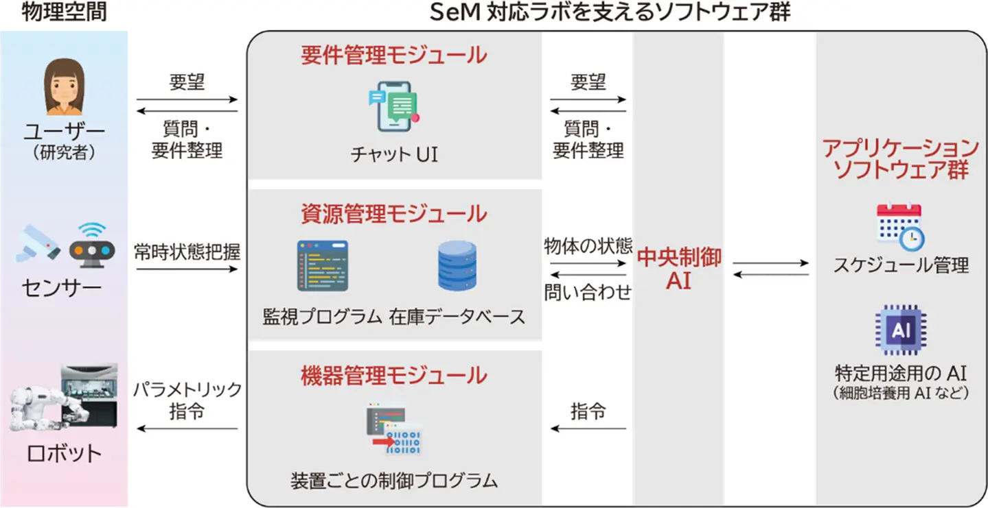 SeM対応ラボは、AIによる中央制御(中央制御AI)と三つの基幹モジュール(要件管理モジュール、資源管理モジュール、機器管理モジュール)で構成される。この構成例では、ユーザー(研究者)はチャット形式で「やりたいこと」をSeM対応ラボと詰めていく。