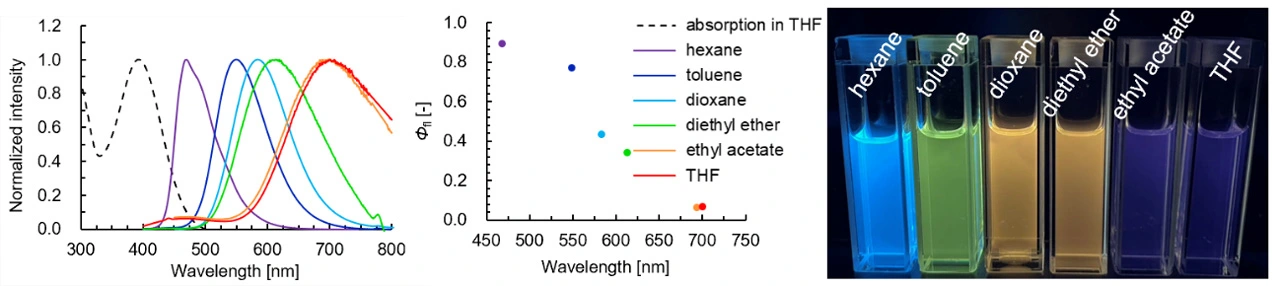 - ソルバトクロミック蛍光色素:周囲の極性によって蛍光波長が変化する色素。機能性蛍光色素として、バイオイメージングだけでなく、化学センサーとして広く用いられている。