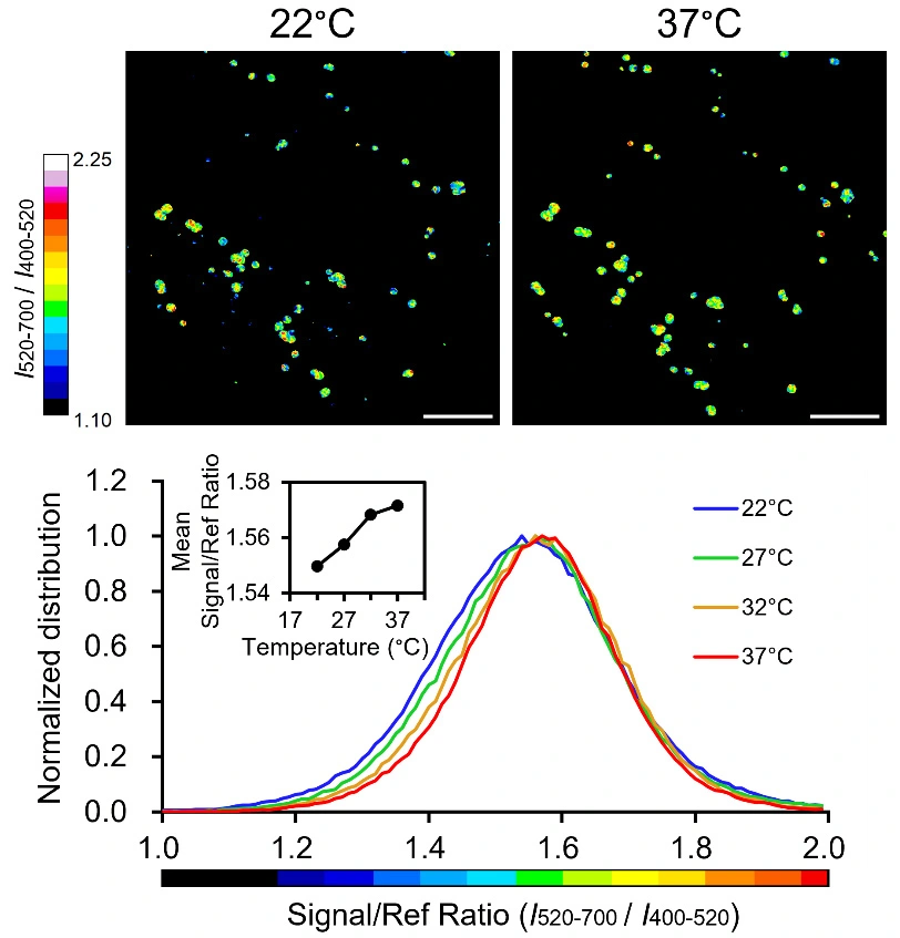 本研究は、レシオメトリック蛍光分子温度計の新たな分子設計指針を示すものであり、非侵襲的な低分子量の有機化合物として過去に例のない高感度・高分解能を示しました。シンプルなメカニズムゆえに用途に合わせた分子設計が容易であるため、温度変化の精密測定による未知の生命現象の解明への貢献が期待されます。