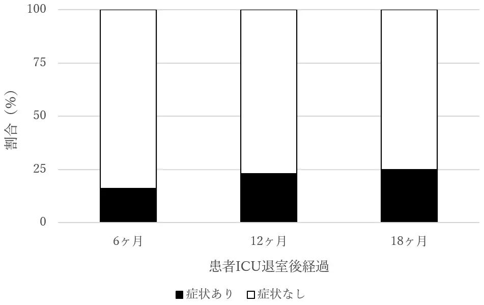 重症COVID-19患者がICUを退室した後の家族を対象に、6ヵ月、12ヵ月、18ヵ月後の追跡調査を実施した結果、PTSD症状を呈する家族がそれぞれ16%、23%、25%と、継続して一定の割合で確認されました。PTSD症状を有する家族では、健康関連の生活の質(HRQOL)を示す指標が有意に低下しており、不安やうつ症状を併発する家族も多いことが分かりました。