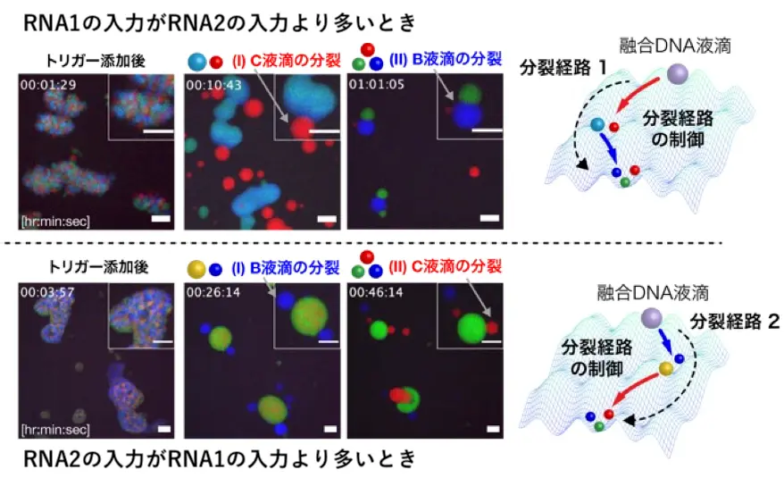 本研究では、RNAや酵素を用いた分子反応によって、DNA液滴の分裂現象に要する時間を制御する機構を開発し、DNA液滴の多段階分裂における分裂順序の制御に成功した。さらに、マイクロRNAの濃度によって分裂の順番が変わるようにプログラミングし、その濃度差を判断する分子コンピューティング機能を持つ人工細胞を構築した(図1)。