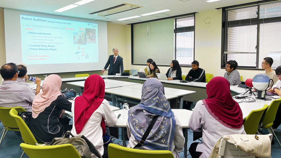 懇談後、両大学一行は工学院システム制御系の中臺一博教授の案内で、AI ロボティクス研究室を見学しました。中臺研究室では、中臺教授ほか学生2名がロボット聴覚や音景分析の研究発表及びデモを行い、AIロボティクス関連研究に関して活発に意見交換しました。マレーシア訪問団からは、学生・研究者の交流に積極的な意向が寄せられました。