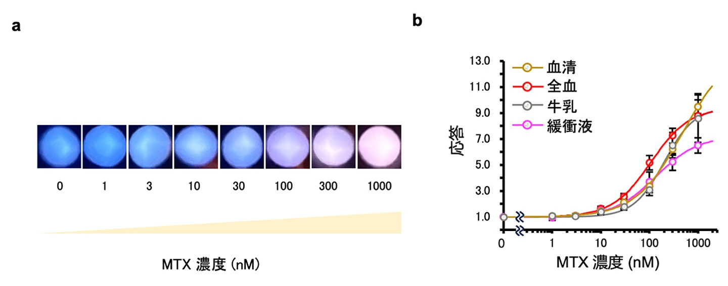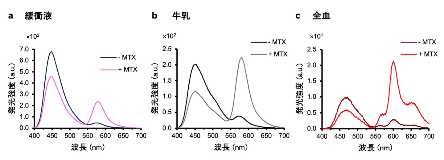 続いて、BRET nano Q-bodyが、生体試料や環境水のような夾雑物を多く含む試料でも抗原を検出できるかを調べました。特に不透明で夾雑物の影響が大きいと考えられる懸濁液として牛乳と血液を選択しました。まずMTXを牛乳および血液に添加した疑似的なサンプルを用意し、いずれも希釈せずにこの免疫センサーと混合することで、試料中のMTXの検出を試みました。その結果、どちらの試料でも、緩衝液で測定した場合と比べて発光強度そのものは小さくなるものの、ほぼ同等の応答が得られ、MTXの濃度依存的に変化しました(図3)。このことから、この生物発光を利用した免疫センサーによって、従来の蛍光センサーでは困難であった不透明な懸濁液における検出が可能であることが確認できました。