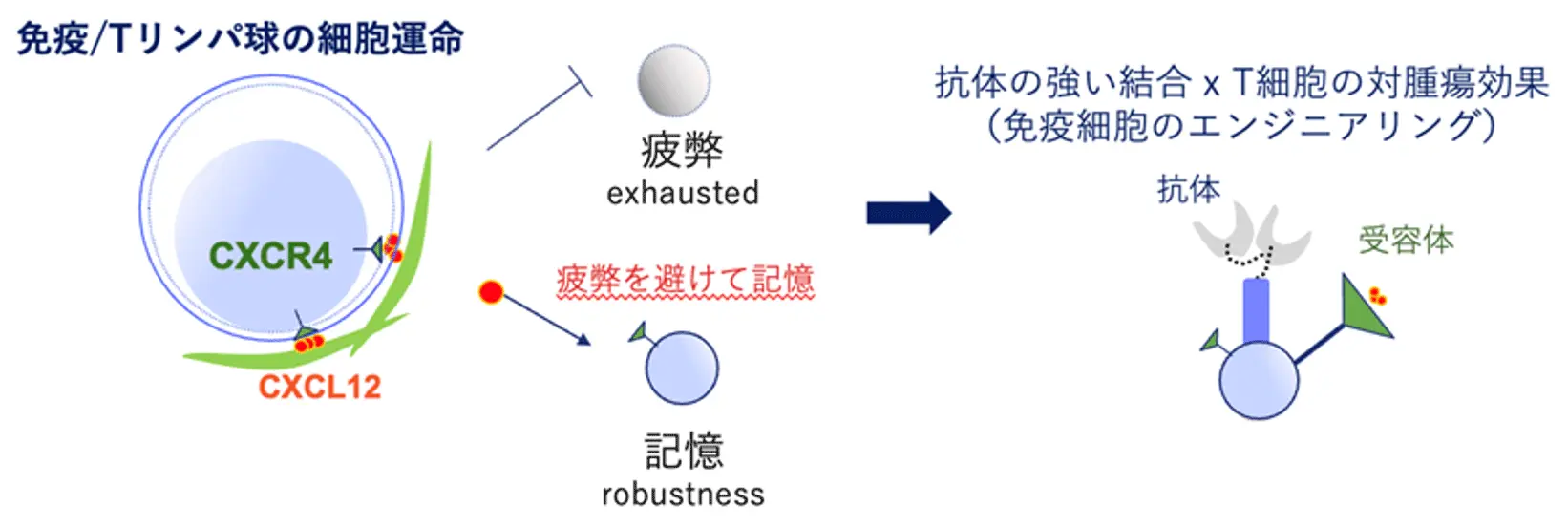 これらの結果から、T細胞において、CXCR4タンパク質と、タンパク質CD25を認識して捕捉する抗体の両方を同時に発現させることで、T細胞が白血病を倒すまで、が長期間にわたり免疫機能を発揮し続けるという仮説を立てました(図1)。