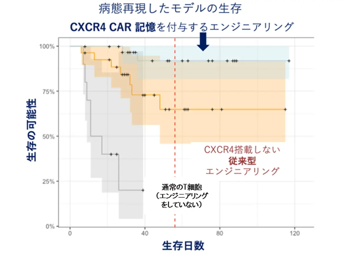CXCR4と抗体を持つ免疫細胞で治療した場合、患者病態を再現したモデルマウスは生存の可能性が高まった。
