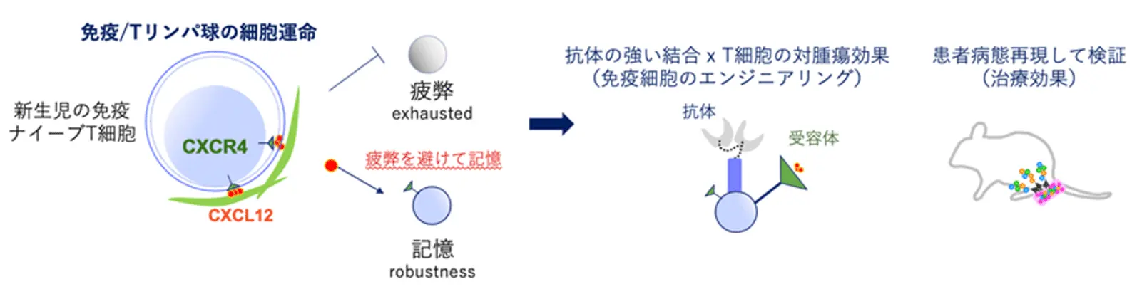 生まれて間もない血液中にあるT細胞が、患者体内に入って白血病細胞などの腫瘍細胞と出合うと「疲弊」して働かなくなることで、病気の再発という結果になる。臍帯血移植と呼ばれる治療で完治した患者のT細胞に多く見つかったタンパク質CXCR4と、白血病細胞を見つけて捕らえる抗体の両者を持たせるエンジニアリングを行い、骨髄・脾臓・肝臓などで患者の白血病細胞を倒せるかを検証した。タンパク質CXCL12は、T細胞のCXCR4タンパク質に結合して免疫が長く作動する機能をオンにする。