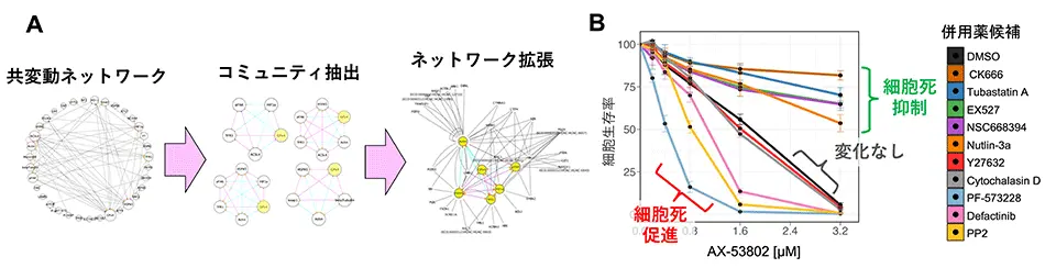 次に、薬剤が引き起こす多面的な細胞応答を一挙に捉えるネットワーク解析法の利点を活かし、併用薬ターゲットの体系的な探索を行いました。相関異常度により抽出されたタンパク質に加え、公共のタンパク間相互作用データベースBioGridを用いてネットワーク拡張を行うことで、より網羅性の高い併用薬候補分子の探索を行ったところ(図4A)、最も有望な候補としてリン酸化FAK、アクチン繊維、MDM2、Ezrin、Cortactinといったタンパク質が抽出されました。そこで、これらの分子の活性を変化させる薬剤をAX-53802と共に添加する実験を行った結果、GPX4とFAK経路の同時阻害によりがん細胞死が促進されることが判明しました(図4B)。一方で、MDM2阻害やEzrin 阻害、Cortactin脱アセチル化、そしてアクチン繊維の分岐を阻害する薬剤によりフェロトーシスが抑制されることが分かりました。以上のことから、併用薬ターゲット候補をネットワーク解析により体系的に抽出する手法の有用性が示されました。