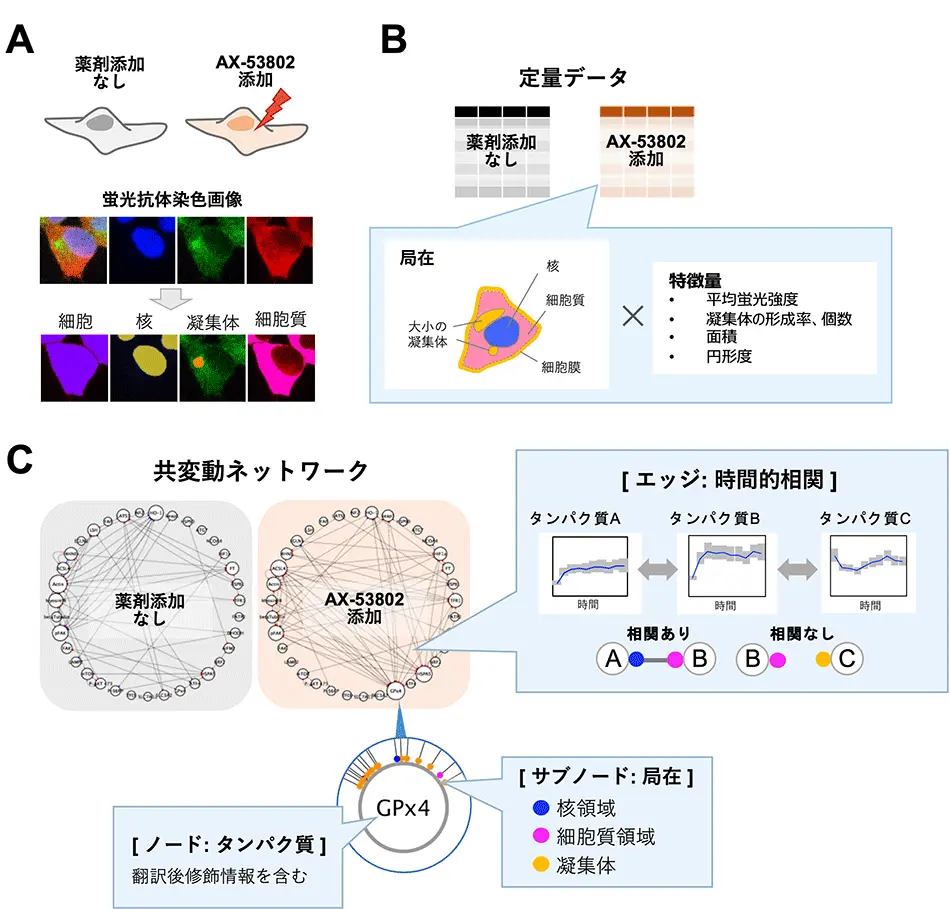次に、ネットワークに表れたより細かな細胞状態の違いを定量的に検出するために、相関異常度[用語6]という指標を用い、AX-53802添加の有無の2条件におけるネットワークの違いにどのタンパク質特徴量が寄与しているかを算出しました。その結果、GPX4以外にもリン酸化FAK、アクチン繊維、トランスフェリン受容体(TfR1)[用語7]といったタンパク質特徴量の変化が抽出されました。特に、GPX4とTfR1において凝集体に関連する特徴量に変化が見られたことに着目し、検証実験を行ったところ、AX-53802添加30分後にGPX4とTfR1、F-アクチンが会合した凝集体を形成することが分かりました(図3B)。また、細胞内の鉄取り込みの動態が変化し、細胞内鉄濃度が減少する事象が観測されたことから、この凝集体形成はフェロトーシス誘導剤に対する細胞の防御機構が作動している可能性が示唆されました。以上のように、共変動ネットワークとその後の検証実験を通じ、AX-53802の作用メカニズムを多面的に明らかにすることができました。