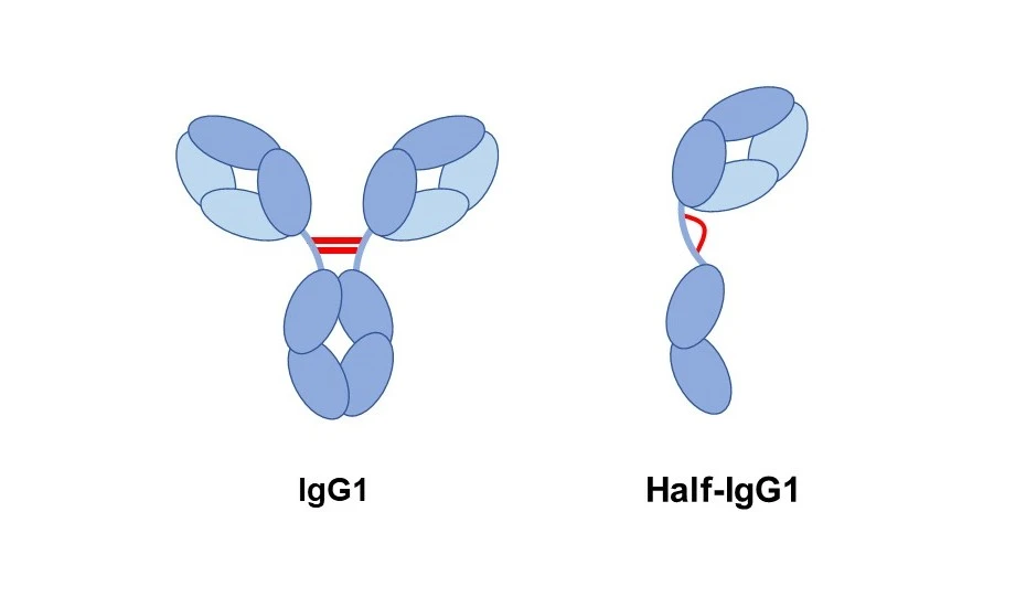 そのアミノ酸を1つだけ取り除いてみると、驚きの現象が起きました。本来なら2本の部品が手をつないでY字になるはずが、それぞれの部品が変形し、1本(ハーフ)のままで安定してしまったのです。研究チームはこれを「ハーフIgG1」と名づけました(図1)。