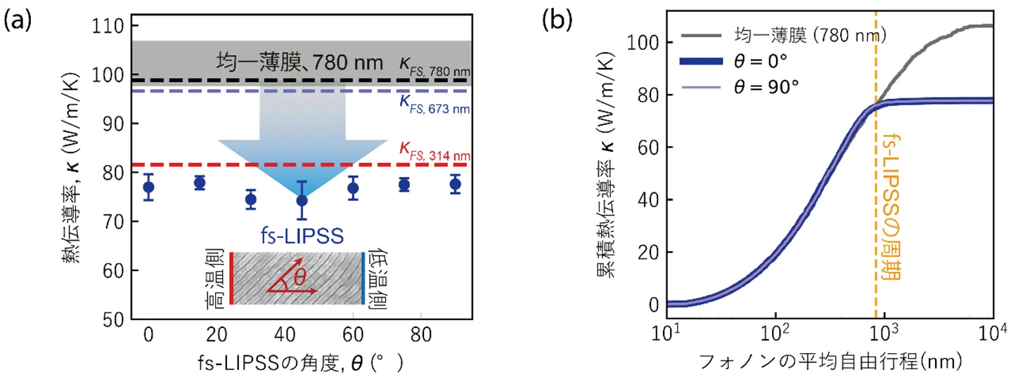 本手法により作製したナノ構造は、既存のシリコン薄膜と比較して、熱伝導率が約25%低い(101W/m/K→76W/m/K)ことが分かりました(図3(a))。この値は単に膜を薄くした場合に予測される従来の理論限界(図中κFSで表した破線)を下回るもので、ナノ構造が熱エネルギーの輸送を有効に阻害していることを示唆しています。また、fs-LIPSSの角度によらず、等方的に熱伝導率が減少していることが分かります。フォノンのモンテカルロシミュレーション[参考文献4]を行った結果、fs-LIPSSの表面粗さはレーザ加工によって増大され、そのためフォノンが散乱しやすくなり等方的な熱伝導をもたらしていることが分かりました。図3(b)は累積熱伝導率とフォノンの平均自由行程の関係を示します。周期的な溝構造が熱伝導の主な担い手である「平均自由行程の長いフォノン」の進行を妨げることが分かります。