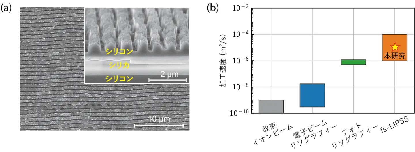 レーザ加工条件の最適化によりfs-LIPSSの高均一化を行い、さらにドライエッチング[用語7]を施すことで酸化膜を除去、薄膜化に成功しました(図2(a))。図2(b)に、従来の加工法と開発したfs-LIPSSプロセスのスループットの比較を示します[参考文献1-3]。本研究の実験条件では、従来の収束イオンビームの10万倍、電子ビームリソグラフィの1,000倍以上の高速で、ナノ構造を製造できることを実証しました。また、従来のフォトリソグラフィ[用語8]に比べて微細な構造が作製でき、非常にシンプルな装置で実装できる特徴を持ちます。