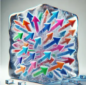 にもかかわらず、この常識を裏切る物質があります。それが「スピングラス」です。スピングラスは、中に含まれる不純物のせいで、原子の小さな磁石(スピン)が足並みをそろえられず、バラバラな向きのまま動けなくなった磁性体です。