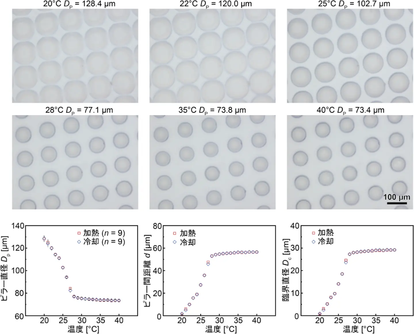 - 微細に配置された温度応答性ハイドロゲル「PNIPAM」の利用により、臨界径を変調。