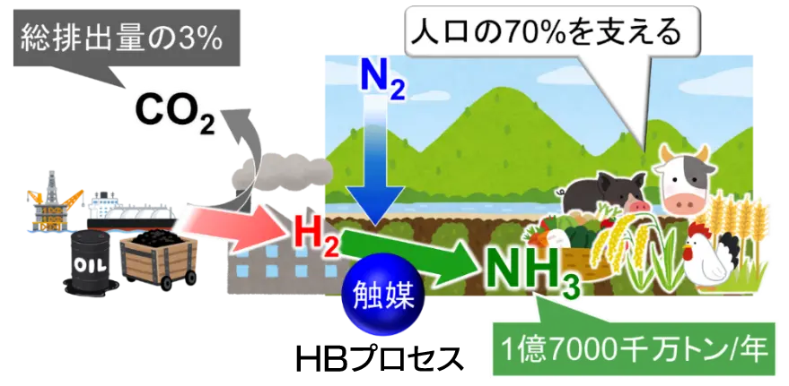 アンモニア(NH3)は、ハーバー・ボッシュ(HB)プロセスによって、触媒を介して水素(H2)と空気中の窒素(N2)から製造される化学物質であり、肥料として人口の70%を支えています。100年以上も前に確立されたHBプロセスは、人類社会に膨大なアンモニアを供給し続けていますが、原料の水素は天然ガス、石炭、石油といった化石資源を燃やして製造されるため、総排出量の3%を越える膨大な量の二酸化炭素(CO2)を排出しています。このため、人口が増え続ける限り、HBプロセスに伴う二酸化炭素排出量は増え続けます(図1)。