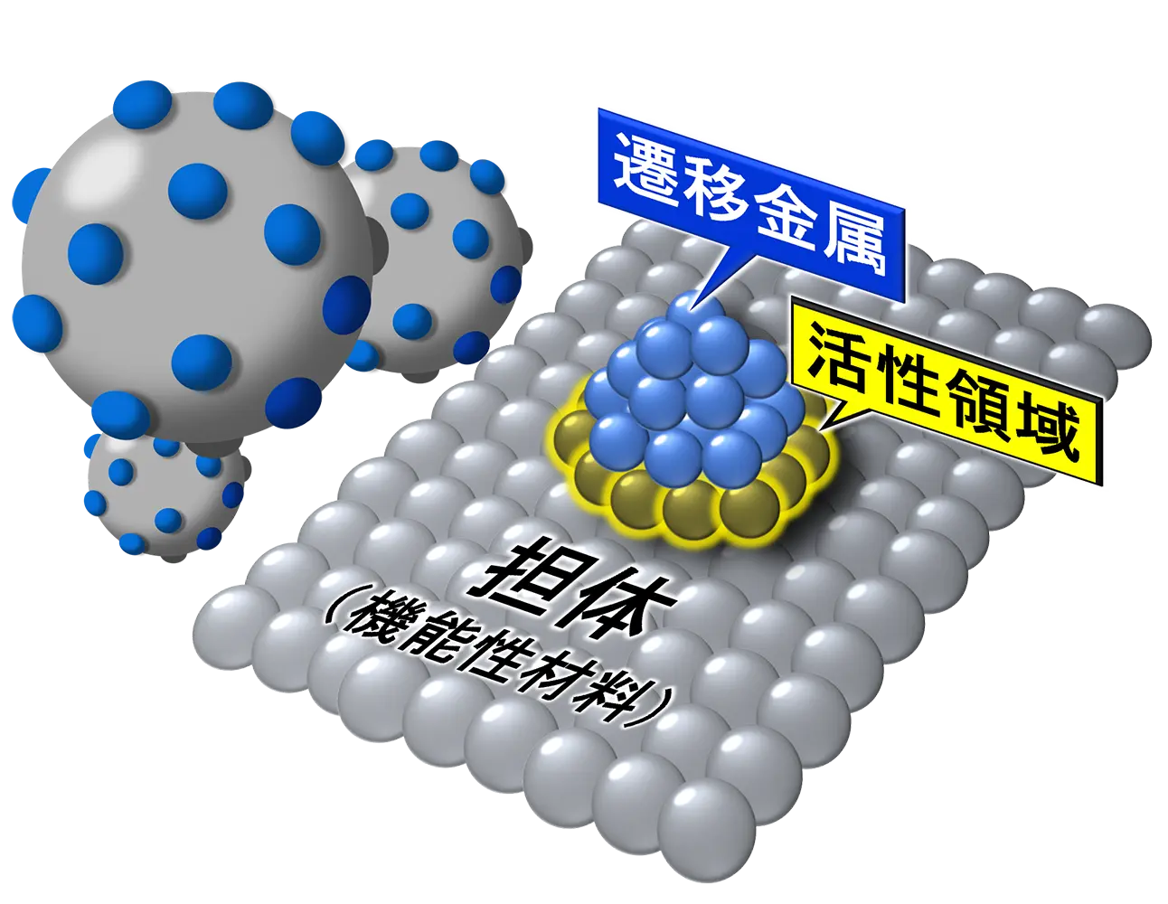 そこで本研究では担持触媒を逆転させた構造を採用しました(図4B)。逆転構造の触媒では、密度の大きな金属粒子の表面にナノサイズの機能性材料「電位供与体」が固定化されます。担持触媒構造のアンモニア合成触媒では、電子供与体の担体の上に金属ナノ粒子が固定化されるため、反応に有効な活性領域は担体-金属ナノ粒子界面の外周金属原子に制限されています(図4A)。これに対して、この逆転構造では活性領域が電子供与体と金属表面の接合点を中心として同心円状に広がります。どちらの構造がアンモニア合成に有効かはこれまで研究されたことはありませんが、逆転構造は密度が高いため、高い触媒性能/容積を期待できます。