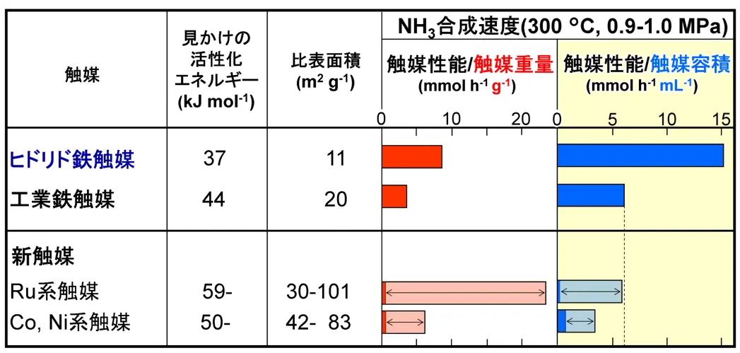 今回開発したヒドリド鉄触媒の触媒性能を、従来の工業鉄触媒や、これまで発表されたルテニウム(Ru)、コバルト(Co)、ニッケル(Ni)をベースにした新触媒の触媒性能と比較としました(表1)。上述のように、これまでに発表された新触媒は、触媒性能/重量では工業鉄触媒に勝りますが、触媒性能/容積で工業鉄触媒を越えることはできません。しかし、ヒドリド触媒は触媒性能/容積で工業鉄触媒の3倍弱の性能を発揮することが分かりました。