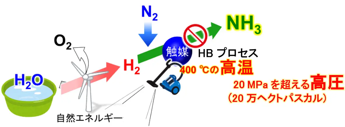 しかし、このルートには本質的な問題があります。それは、HBプロセスを駆動するために高温・高圧が不可欠であり(図2)、大量のエネルギーを消費してしまうことです。せっかく手に入れたグリーン水素の一部がHBプロセスを動かすために使われるため、自然エネルギーとアンモニア製造量の手取りが減ってしまうことになります。