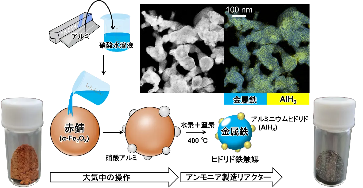 - ヒドリド鉄触媒はアンモニア製造中にアルミを加えた赤錆から自動生成。