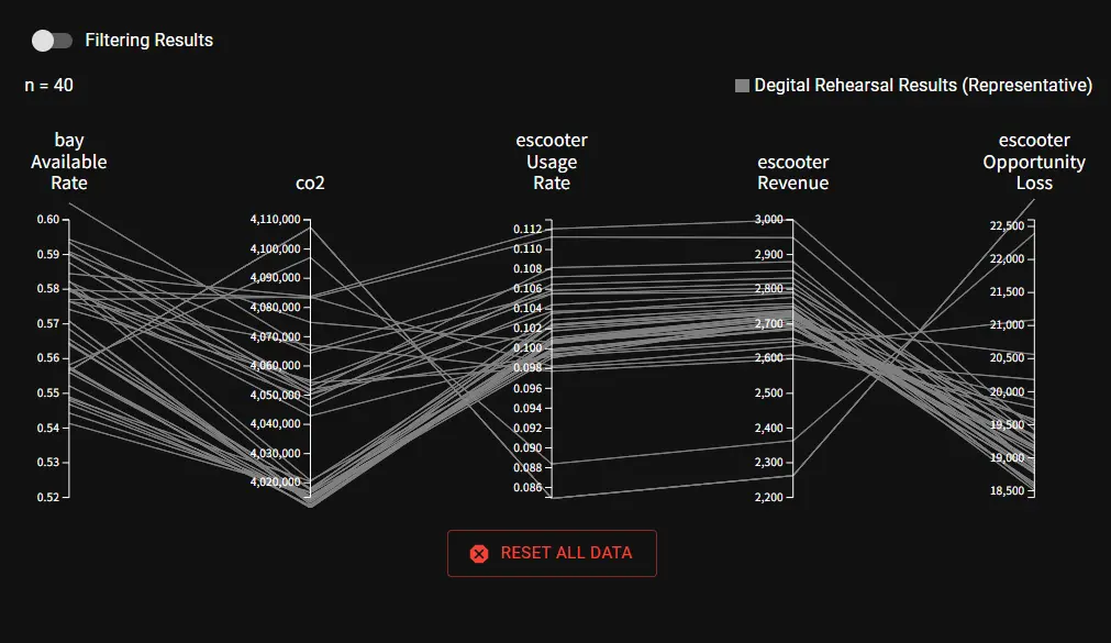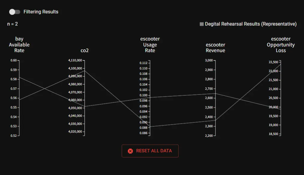 シェアドモビリティのシステム運用においては、エリア内の各拠点に適切な台数の電動スクーターを配置する必要があります。この初期配置はエリアのCO2削減効果・利用者の利便性・事業者の収益など多様な指標に影響するため、慎重に決定する必要があります。このために、さまざまな初期配置に基づくシミュレーション試行を繰り返し、その中から良い配置を探索により決定します。本実験では、2台のシミュレーションコンテナと1台の結果集約コンテナから成るコンテナ協調型シミュレータを使用しました。インタラクティブな探索では、ユーザが次に注目したい施策範囲を指定してから探索結果を提示するまでの時間短縮が極めて重要です。